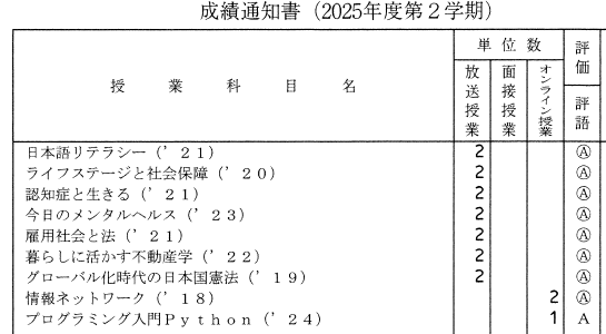 1150030:日本語リテラシー('21) (基盤科目、放送授業、15時間、2単位)閉講 1710214:暮らしに活かす不動産学('22) (生活導入科目、放送授業、15時間、2単位)閉講 1519352:認 知症と生きる('21) (生活専門科目、放 送授業、15時間、2単位) 1519433:今日のメンタルヘルス('23) (生活専 門科目、放 送授業、15時間、2単位) 1519263:ラ イフ ステージと社会保障('20) (生活専門科目、放送 授業、15時間、2単位)閉講 1539345:雇用社会と法('21) (社会専門科目、放送授業、15時間、2単位) 5750059:プログ ラミング入門Python('24)(情報導入科目、オンライン授業、8時間、1単位) 5750016:情報ネットワーク('18) (情 報導入科目、オンライン授業、15時間、2単位)閉講 合計:9科目、17単位